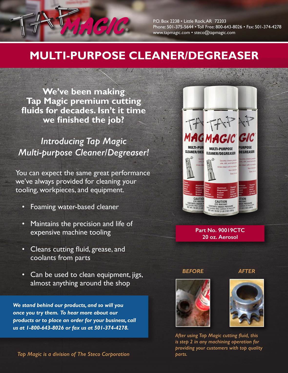 We’ve been making Tap Magic premium cutting fluids for decades. Isn’t it time we finished the job? Introducing Tap Magic Cleaner! Designed specifically for cleaning your tooling, workpieces, and equipment, it is also an excellent general purpose cleaner for anything around the shop or plant. After using Tap Magic cutting fluid, this is step 2 in any machining operation for providing your customers with top quality parts.